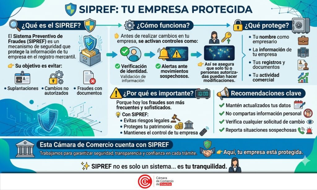 La seguridad de la información registral es un pilar fundamental para el desarrollo económico y la confianza empresarial. Por ello, desde la Cámara de Comercio de Soacha ponemos a disposición de todos nuestros empresarios y entidades sin ánimo de lucro el Sistema Preventivo de Fraudes, conocido como SIPREF. Este mecanismo institucional, de carácter preventivo y totalmente gratuito, está diseñado para blindar la información pública de su negocio y garantizar su absoluta integridad.